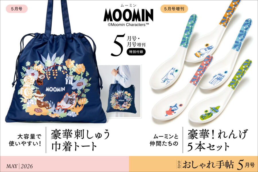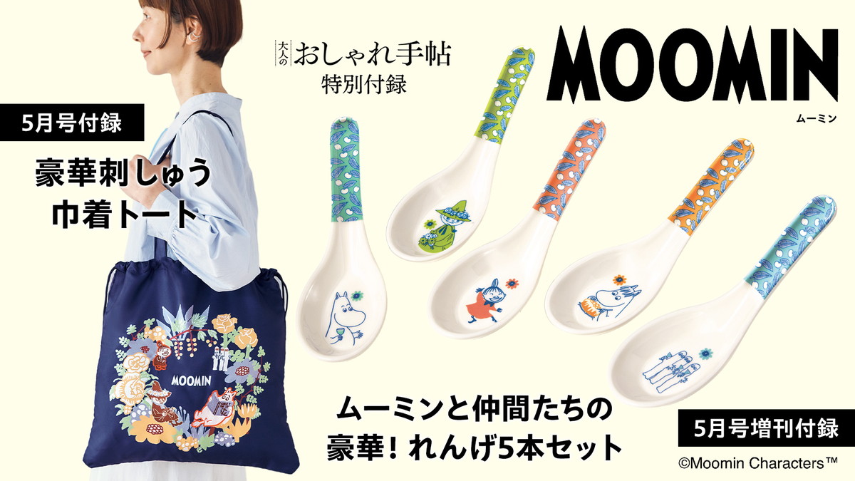 【雑誌付録_ムーミン】豪華刺しゅう仕様が華やかな上品トートバッグ! 増刊号は眼福♡かわいさ100点! れんげ5本セット 付録違いの6月号が2冊同時発売!