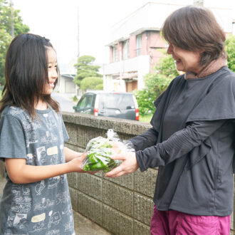 収穫したピーマンをご近所さんにお届け。「そうすると、またお返しの野菜をいただいたりして…そんな温かいコミュニケーションも新鮮で嬉しいですね」。自分が作った野菜をお裾分けすることで、自分のことを知っていただけると同時に、どんなことをやっている者なのか、名刺代わりにもなります。
