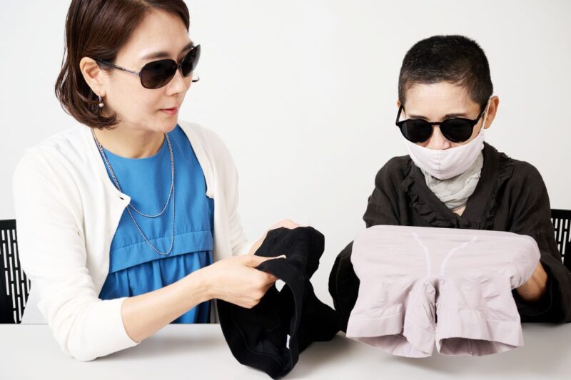 ライターMと編集Mが実際に触って、生地感や伸びのよさをチェック。「ふむふむ……、生地自体は肌触りがよく、やわらかいけれどハリがあってしっかりしたつくりですね」(編集M)。「触った感じはとてもなめらか。ウエスト部分も伸びのよいリブになっていて、はいていてストレスなさそう!」(ライターM)