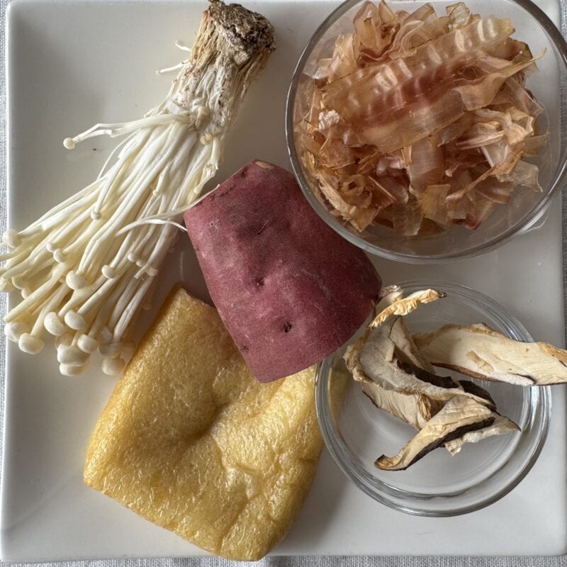 ⑤ ④にさつまいも、えのき、油揚げを入れ加熱し、みそを溶き入れる。