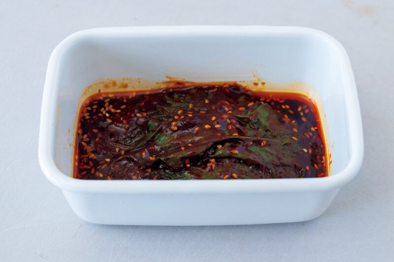 1. Aをよく混ぜ、清潔な保存容器に入れる。青じその両面につけてなじませ、ラップをピッチリとして、冷蔵庫に1 時間以上おく。