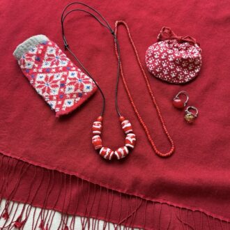 これからの季節の赤いアクセサリーです。気に入っているネックレスやペンダントは布の袋に入れてしまっています。赤い木の実のような小さなものは、袋から取り出すたびに、可愛い可愛いと思うのです。