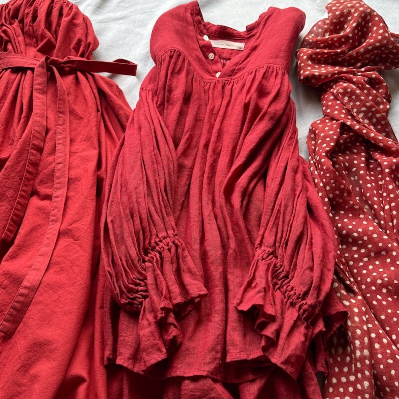 娘の頃から赤色を好みましたが、少しずつ「着る赤」が変わってきています。もちろん変わらずに着続けているものも多いのですが、今年はお休みにしようと思うワンピースやノースリーブのブラウスもありました。さてさて、新しい赤色のコーディネートをパズルのように考えて、秋を楽しく色鮮やかに暮らしたいと思います。