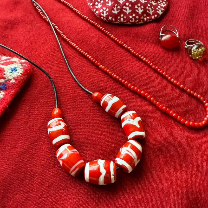 大きさが少しずつ違う大きなトンボ玉のネックレスは随分以前に自分で組んだのですが、今なら七粒にしたはずですし、間に薄いビーズを入れたかなと思います。今はなくなってしまいましたが、渋谷にアクセサリーのパーツを扱っている広くて雰囲気のあるお店がありました。トンボ玉、天然石、樹脂などの物が多く、とても好みでしたので、今もそのお店で購入したアクセサリーは変わらずに愛用しています。ヴィンテージの小さなビーズのネックレスは、20年ほど以前に自由が丘にあったアジアの民芸品を扱うお店で買い求めました。小さな建物の2階にあったあのお店によく通いました。ただただ濃い赤が美しいと思い、着け続けています。