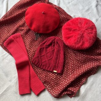 赤い帽子は三つ。フェルトのベレー帽、ふわふわのベレー帽、カシミアのニットキャップ。フェルトのベレー帽はおでこに跡がついてしまうので、頭の後ろのところに細工をして、茶色の毛糸で編み上げにしましたら、ワンポイントでとても可愛くなりました。ふわふわのベレー帽はhareiroで作っていただいたわたしのオリジナルカラーです。フィッシャーマンのニットキャップは、カシミアでとても軽くて暖かいので冬になると重宝します。インド更紗のストールは水玉とは言いがたい「ちょんちょんちょん」が木版でプリントされています。これはたまらなく良い味なのです。ちょんちょんちょん、ちょんちょんちょん。