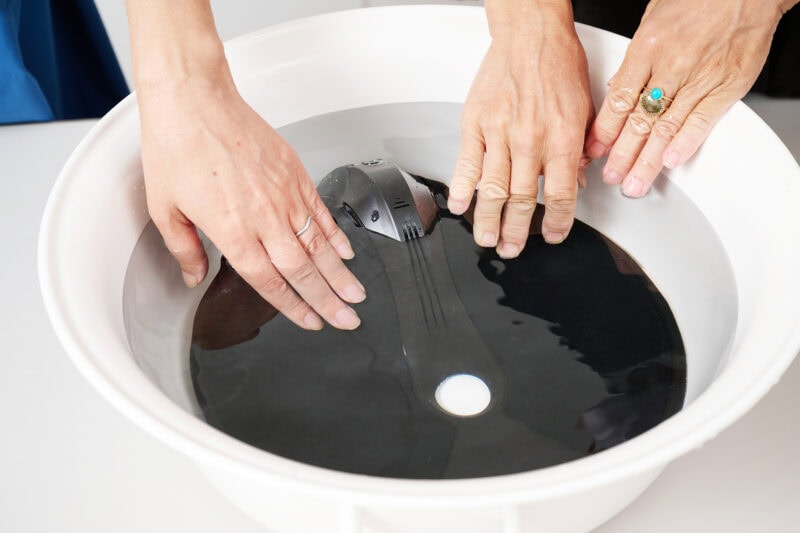 水に入れる前に充電口カバーがしっかりと閉まっていることを確認し、本体を水の中に沈め、電源をオン。編集MとライターMが、通電部分に手で触れてみました。「きました! ピリピリとEMSの刺激を感じます」とライターM。「水の中だから通電しやすいのか、レベル1でもしっかりと刺激を感じます」(編集M)