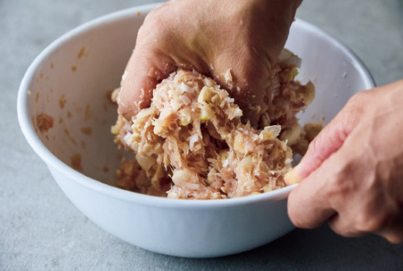 2. ボウルに鶏ひき肉と塩を加えてよく練り、粘りが出てきたら1、片栗粉を加えて混ぜ合わせ、食べやすい大きさに丸める。