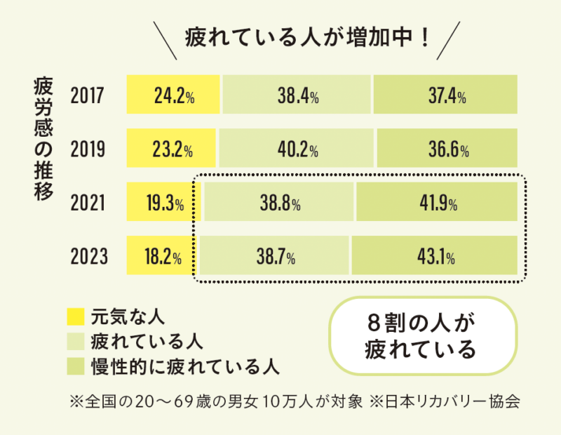 日本リカバリー協会の調査でも「日本人の約8割が疲れている」という結果が出ています。