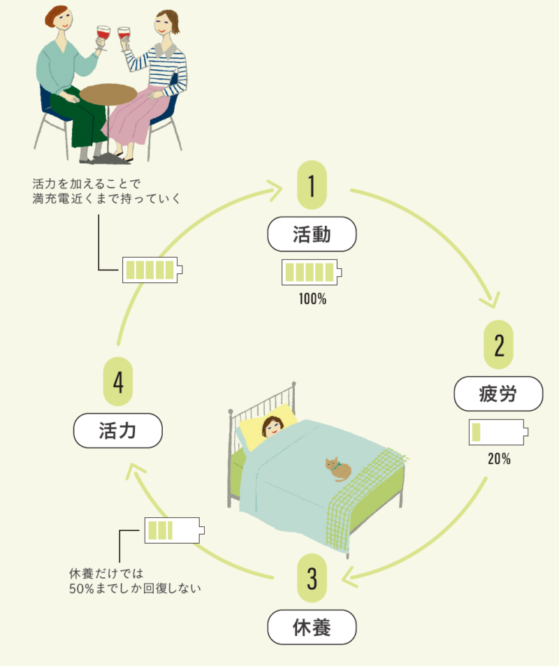 「100%フル充電するには、次の〝活動〟の前に〝疲労〟を打ち消す要素が必要です。その要素が、疲労の反対語である〝活力〟なんです」
