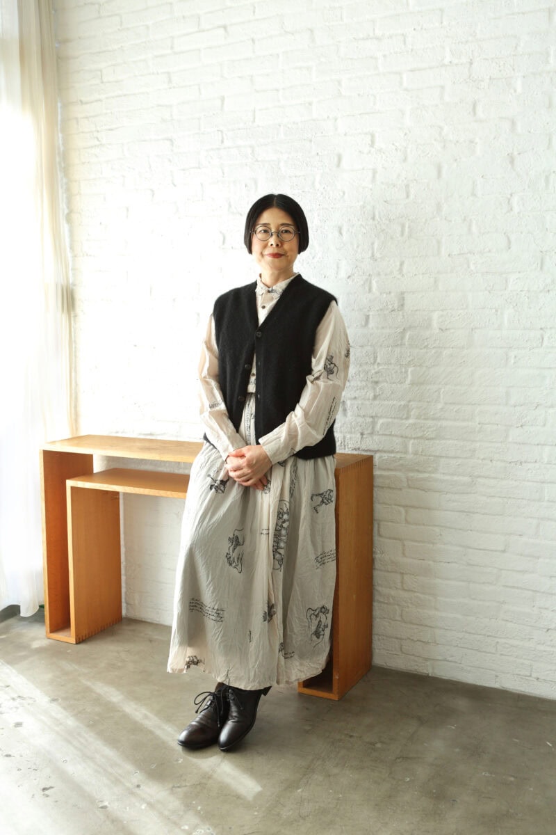 「幻想的なタッチのプリントが子どもっぽく見えないのは、余白があるからです。だから、どんなトップスにも合わせやすいです」と須田さん。
