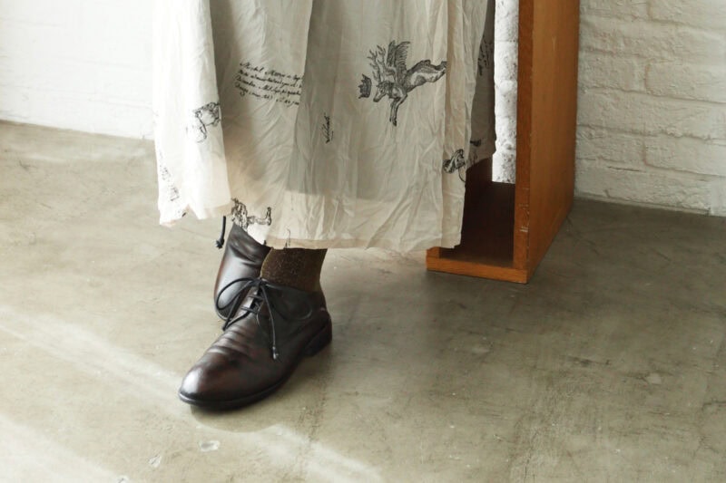 「ブラウンのレースアップシューズに、エイジング加工を施してあります」と須田さん。ピカピカの新品にはないニュアンスがあり、こなれ感がおしゃれです。