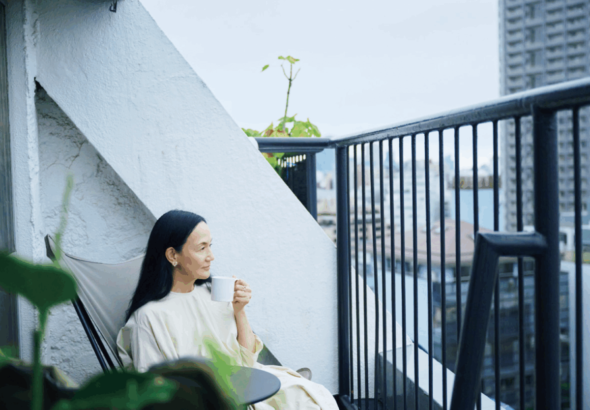朝のひと時、ゆったりベランダでコーヒーを飲む時間は至福の時。「『ご自愛』って自分に言ってあげていいと思うんです。