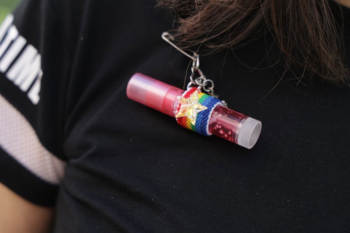 唇が乾きやすいので、リップクリームは必須。「いつでもさっと出して塗れるように、安全ピンで服に留められるクリップを手作りしました。家には柄違いでいくつもあります」