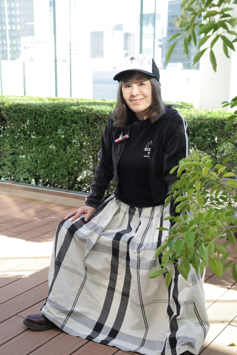 いつもインタビュー取材では「少女マンガ家のイメージにふさわしい、ゴージャスな服を着る」という一条さんですが、この日は撮影があることを知らず、カジュアルなスタイルに。「スカートは、よく行く吉祥寺の古着屋で買ったもの。500円には見えないでしょ!?」