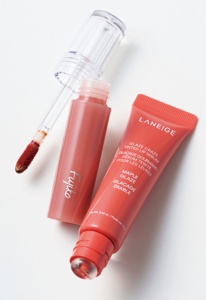 (右)落ち着いたピンクベージュ。95%スキンケア成分配合で、唇にうるおいを届け続ける。ラネージュ グレイズ ティントリップセラム メープルグレイズ¥2,200/LANEIGE