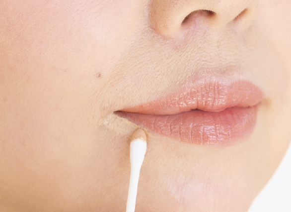 綿棒の先にファンデーションを少し取り、口角の下に輪郭に沿って1㎝程度線を引く。