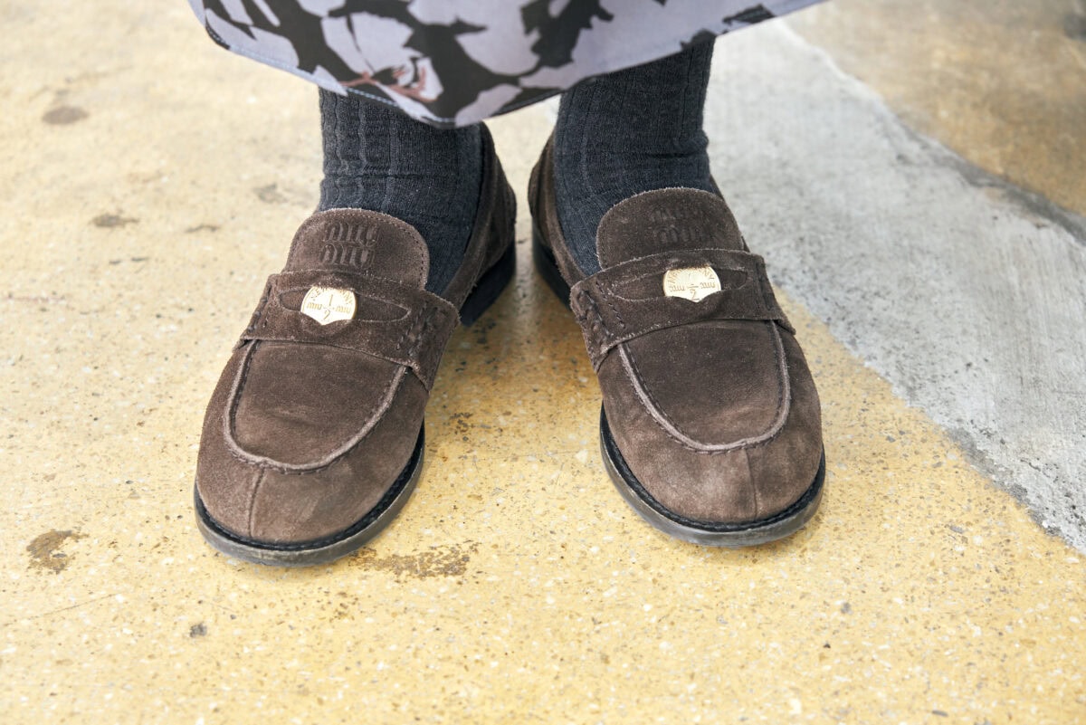ディレクターという職種は、デスクワークもあれば外回りや、ショップで接客することも。「ヒールはなくても、きちんと見えるレザーのローファーが多めです。ボアベストやセットアップの雰囲気に合わせました」(森さん)