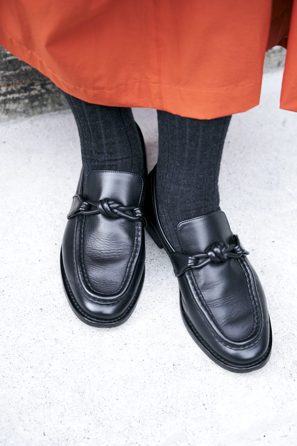 ボッテガ・ヴェネタのシグネチャーデザインのローファーは、ダンスシューズにインスパイアされたもの。鮮やかなロングスカートをメンズライクなローファーで引き締めました。「カジュアルなデザインのコートジャケットに、このローファーを合わせると、商談の席にも自信をもってのぞめます」(森さん)