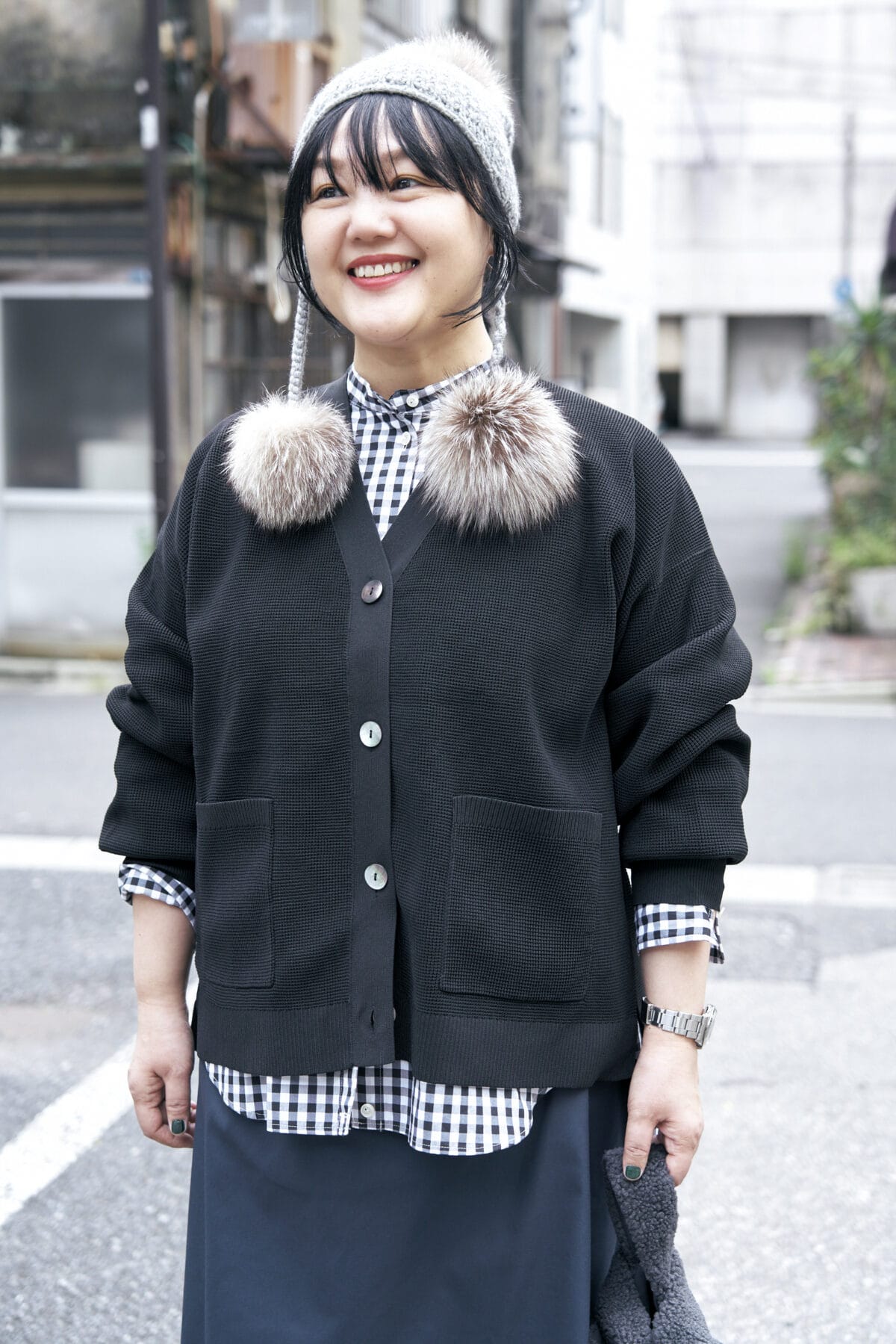 朝から急に冷えこんだ木曜日には、4wayのロングコートをはおりました。「このコートは、今シーズンの一押しで、レリルのコートの完成形です。単体でブルゾンとしても着られるリバーシブルのライナーが付いているので、春先まで長く着られます」と森さん。インには、ギンガムチェックのシャツとカーディガン、バルーンスカートを合わせて、ポップなモノトーンにしました。グレーのフェイクファーバッグとファー付き帽子で、チャーミングな冬の着こなしに。
