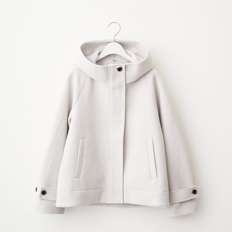 「ショート丈のブルゾンを選ぶなら、今年はブルゾンタイプのものではなく、スポーティさを抑えたデザインのものがおすすめです。こちらは、顔まわりの印象を華やかに、そして小顔効果も期待できるフーディタイプ。比翼仕立てでフロントジップも隠れるデザインなので、きちんと感もアップ。しっかりした素材なのにしなやかさもあり、動きやすさも確保。首元までジップを上げてボタンを閉めるとスタンドカラーになるのですが、ファンデーションがつきにくい高さにアップデートしたのだとか。大人にうれしい工夫満載です」