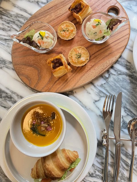 最初に登場したのは、日比谷パレス特製「季節のセイボリー」。サーモンとレタスのクロワッサンサンドに季節野菜のヴルーテ(かぼちゃのスープ)、ミートパイ、ポテトサラダ、エビとホワイトソースのミニタルトが楽しめます。