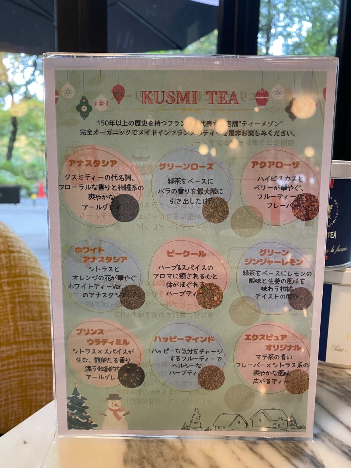 アフタヌーンティーでは、フランス大統領官邸エリゼ宮との特別なコラボレーションティー(3種)やクスミティーの代名詞であるアナスタシアなど、12種類から選ぶことができるプランもあります。スイーツと一緒に、好みの味わいを探しながらいろいろな紅茶をぜひお楽しみください♪