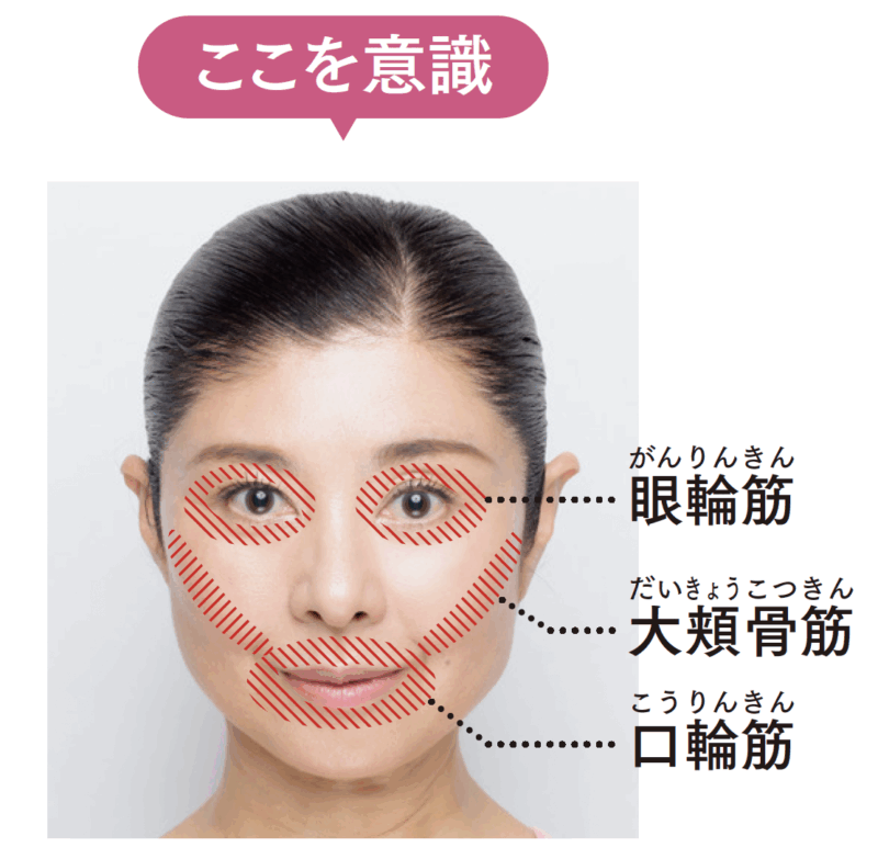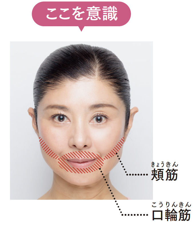 「頬筋」と「口輪筋」を使って、頬を引き上げ、輪郭を引き締めましょう。