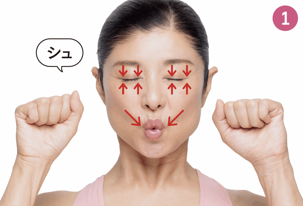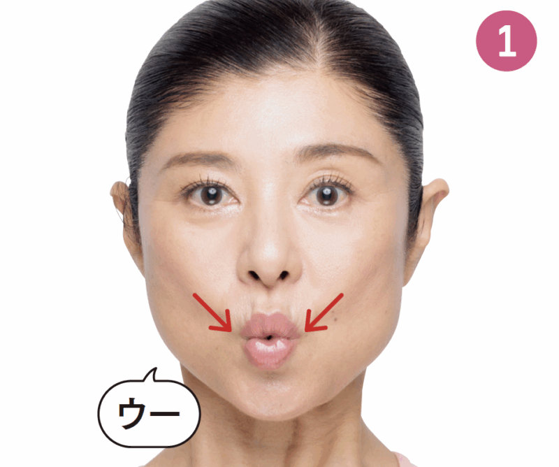「ウー」の口をキープして、頬の筋肉を斜め上に引き上げます。正面に戻し( 1 )、反対側も同様に。