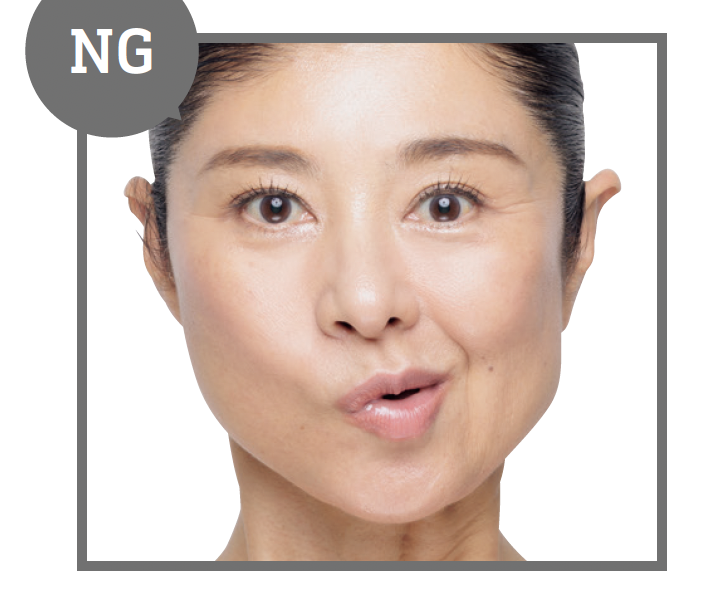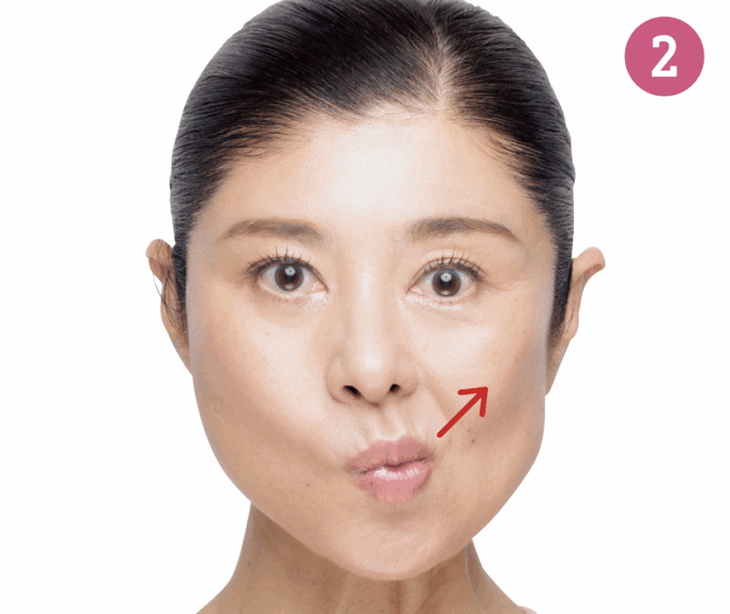 「頬筋」と「口輪筋」を使って、頬を引き上げ、輪郭を引き締めましょう。