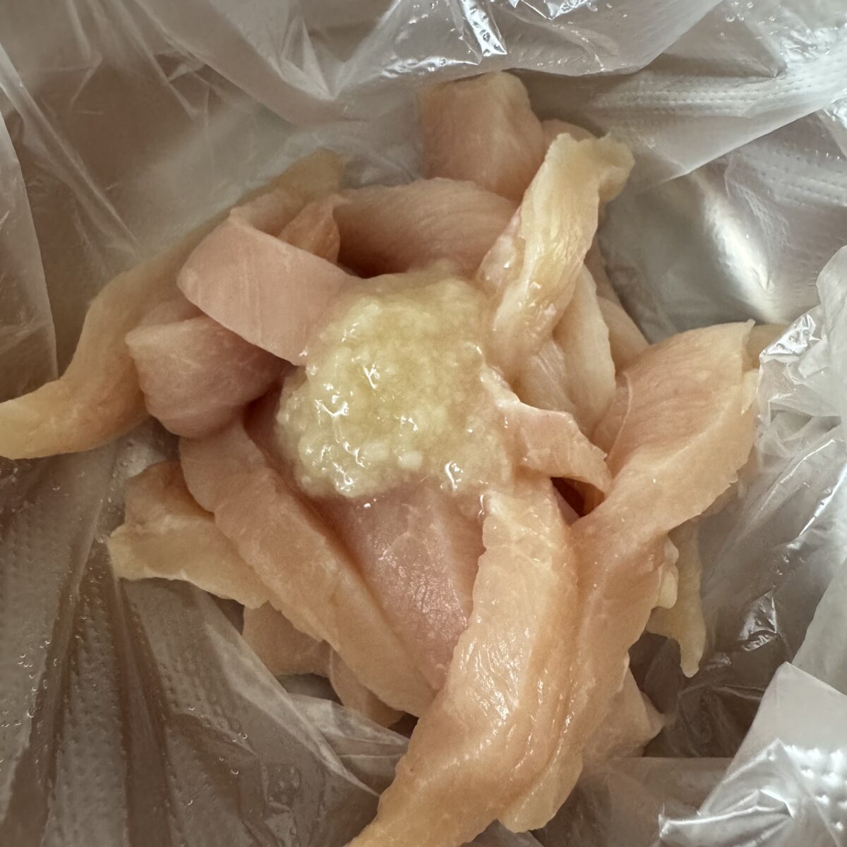 ② ビニールに鶏むね肉と塩麹を入れ揉み込み、10分おく。