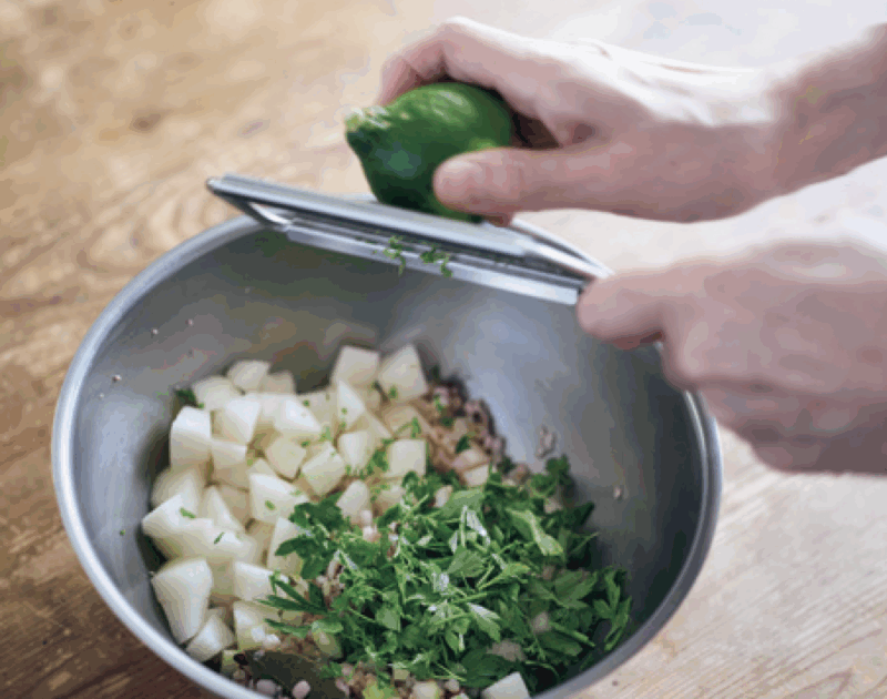 ライムの皮をすりおろしながら加えて香りづけを。レモンを使ってもOK。