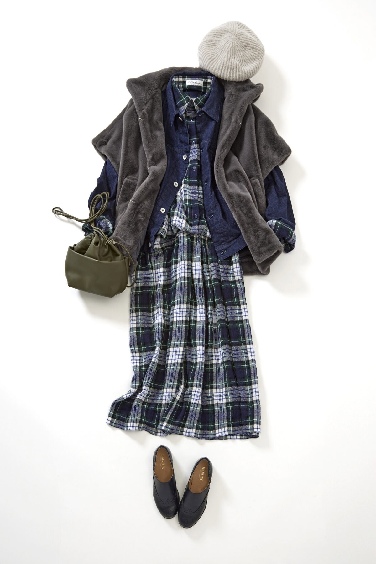エコファーポンチョコート¥44,000/ボールジィ(トゥモローランド)、デニムジャケット¥29,700/アップサイクルリノベーシック(ネストローブ 渋谷店)、チェックロングシャツ¥41,800、スカート¥33,000/ともにタバサ(パパス)、ベレー帽¥14,300/ケイ ハヤマ プリュス、バッグ¥39,600/レキップ、シューズ¥15,950/ハルタ