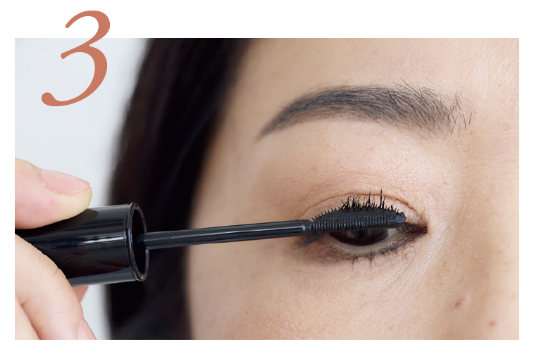 マスカラをまつ毛の根元に当て、左右に動かしてコームにまつ毛を入れ込み、毛先へスーッ。