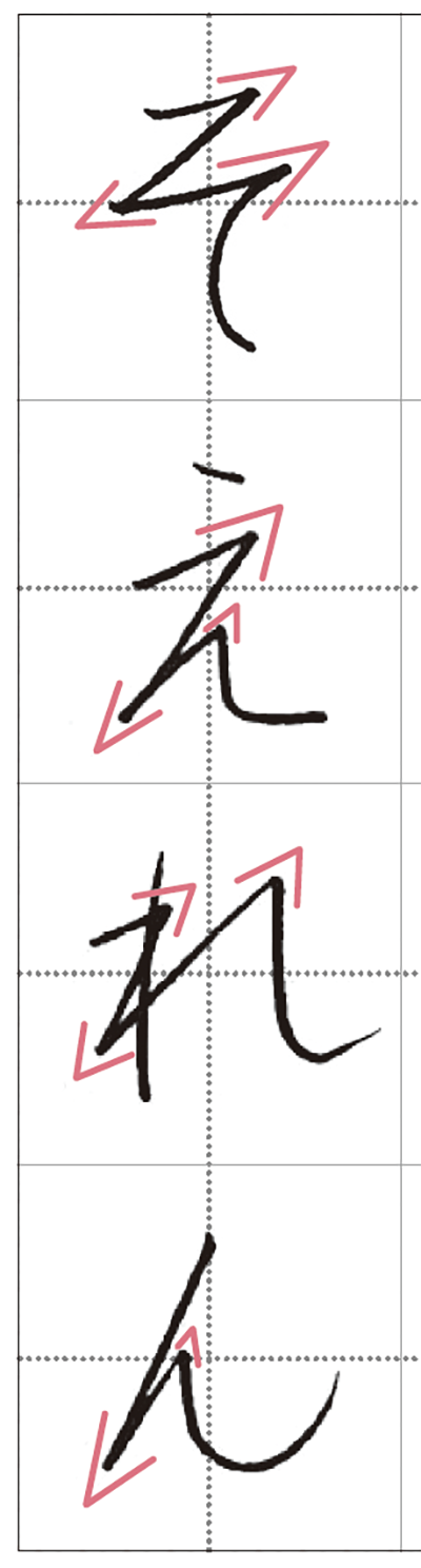 くるっと回す「結び」はひらがな特有の部位。結びには「よ」などの「横結び」と、「す」などの「縦結び」がありますが、どちらも丸くすると幼い印象に。横結びは「へ」、縦結びは「く」をイメージし、少し角をつけましょう。