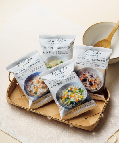 薬膳から考えられた赤の「梅しそ」、黄色の「やさい潤穀」、白の「おろし貝柱」、黒の「にぼし黒豆」の4種類で、低糖質&低カロリー。