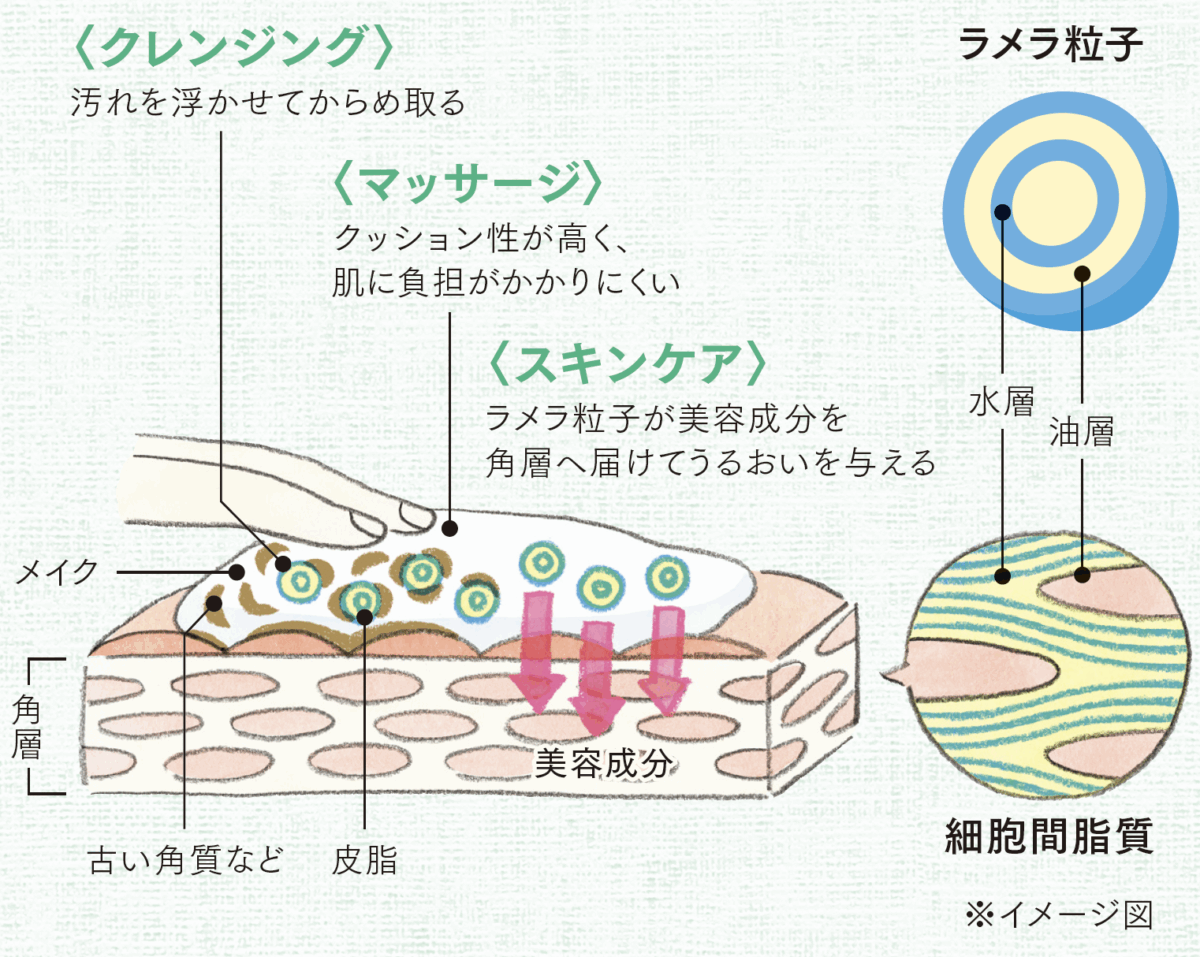 角層の細胞間脂質と類似した構造で、肌との親和性が高く、クレンジング・マッサージ・スキンケアの3つの機能を発揮します。