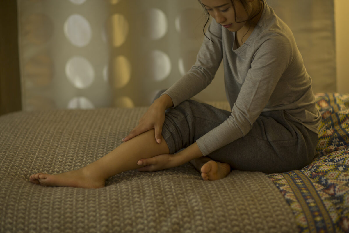 入浴後にタオルで体を拭いたらすぐ、マッサージオイルやホホバオイル、ボディクリームなどで足腰を保湿して乾燥から腎陰を守りましょう。保湿剤を手にとったら、へその真裏にある「命門(めいもん)」のツボ周辺に円を描くようにやさしく塗り広げ、その後下半身へと軽く流します。その後、足全体にもやさしくなでるように保湿剤を塗ってください。特にふくらはぎの内側部分は腎につながるエリアなので、忘れずに保湿を。