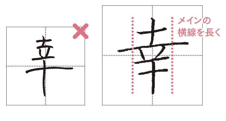 横線の多い漢字の場合、すべての横線が同じ長さだと、単調で美しく見えません。