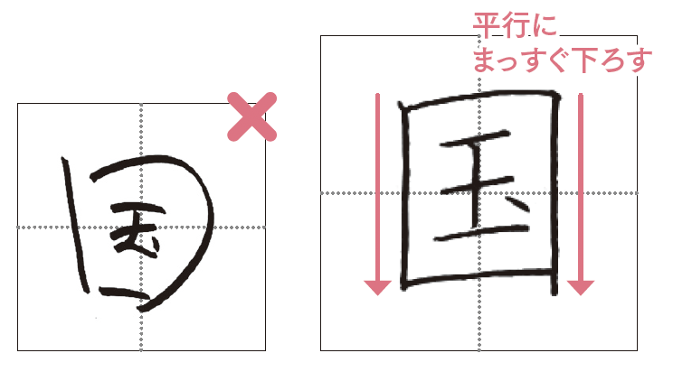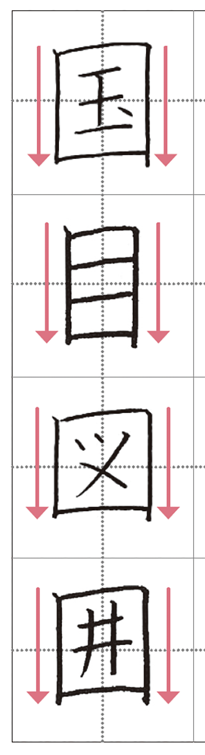 このうち、「国」「目」などの縦長囲みの漢字は、両側の縦線をまっすぐおろすと、字形が安定して、大人っぽくまとまります。