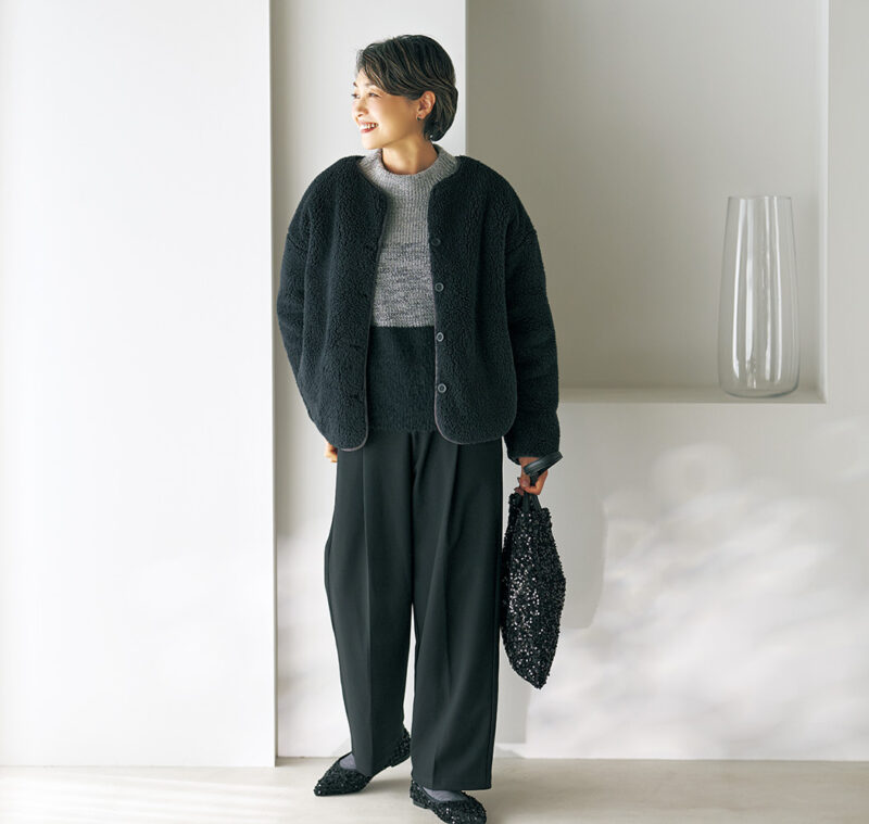 丸みのあるシルエットが可愛らしいジャケットは、しゃれ感のあるグラデーションニットに、センタープレスのパンツを合わせたモノトーンコーデでシックに格上げ。