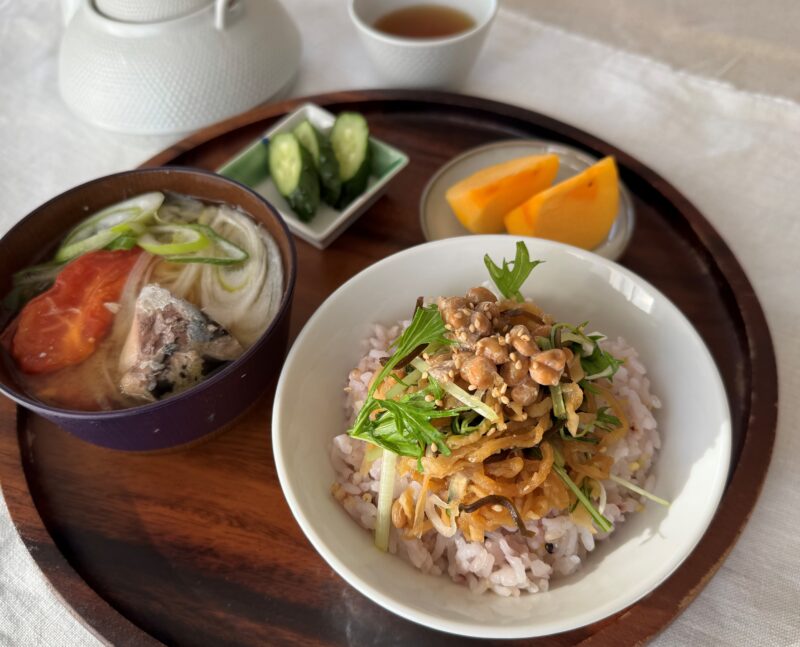 「切り干し大根と納豆の雑穀ごはん」「さば缶とねぎ・トマト・春雨のみそ汁」