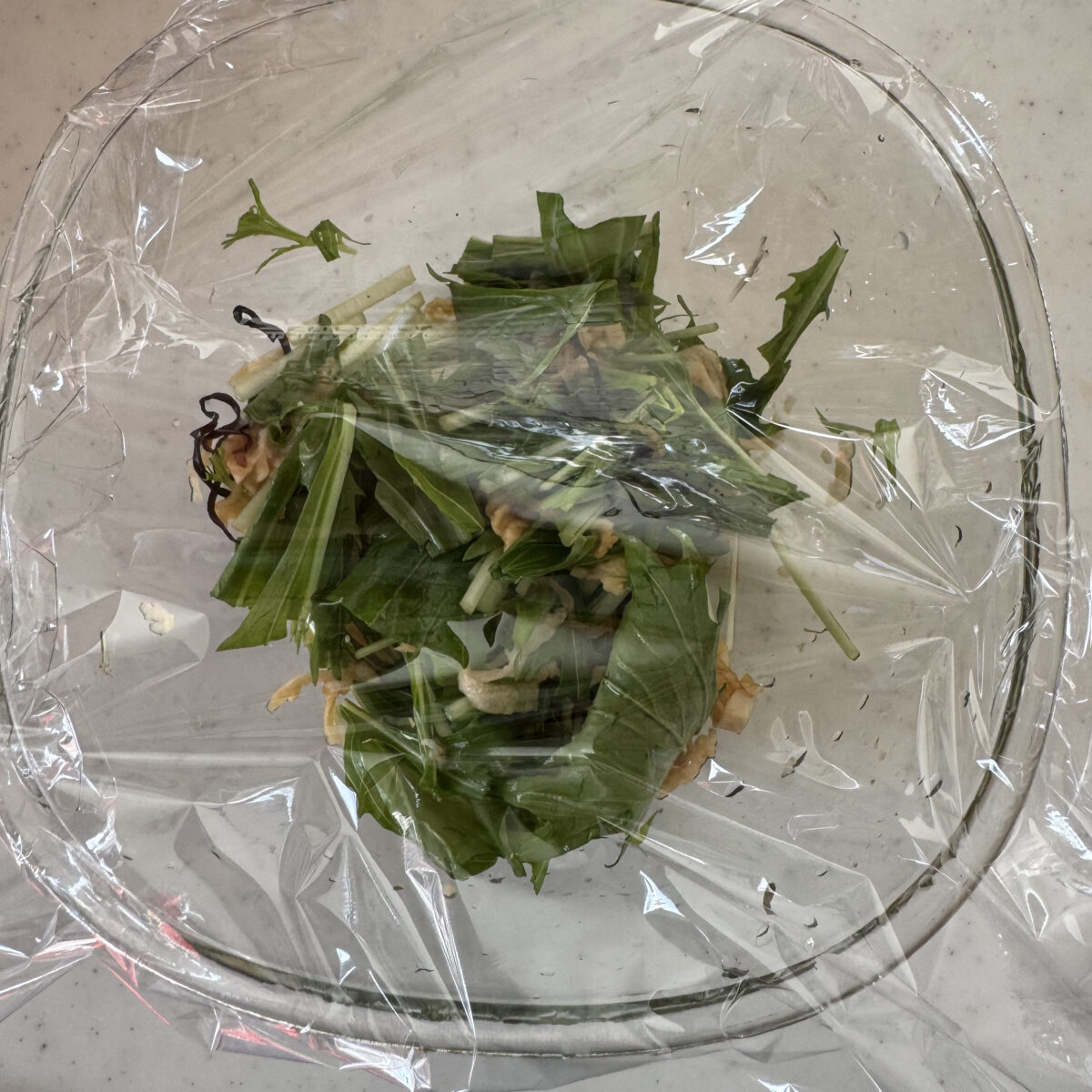 ③ 耐熱容器に①と水菜1/2株と塩昆布を入れ600Wレンジで4分加熱する。
