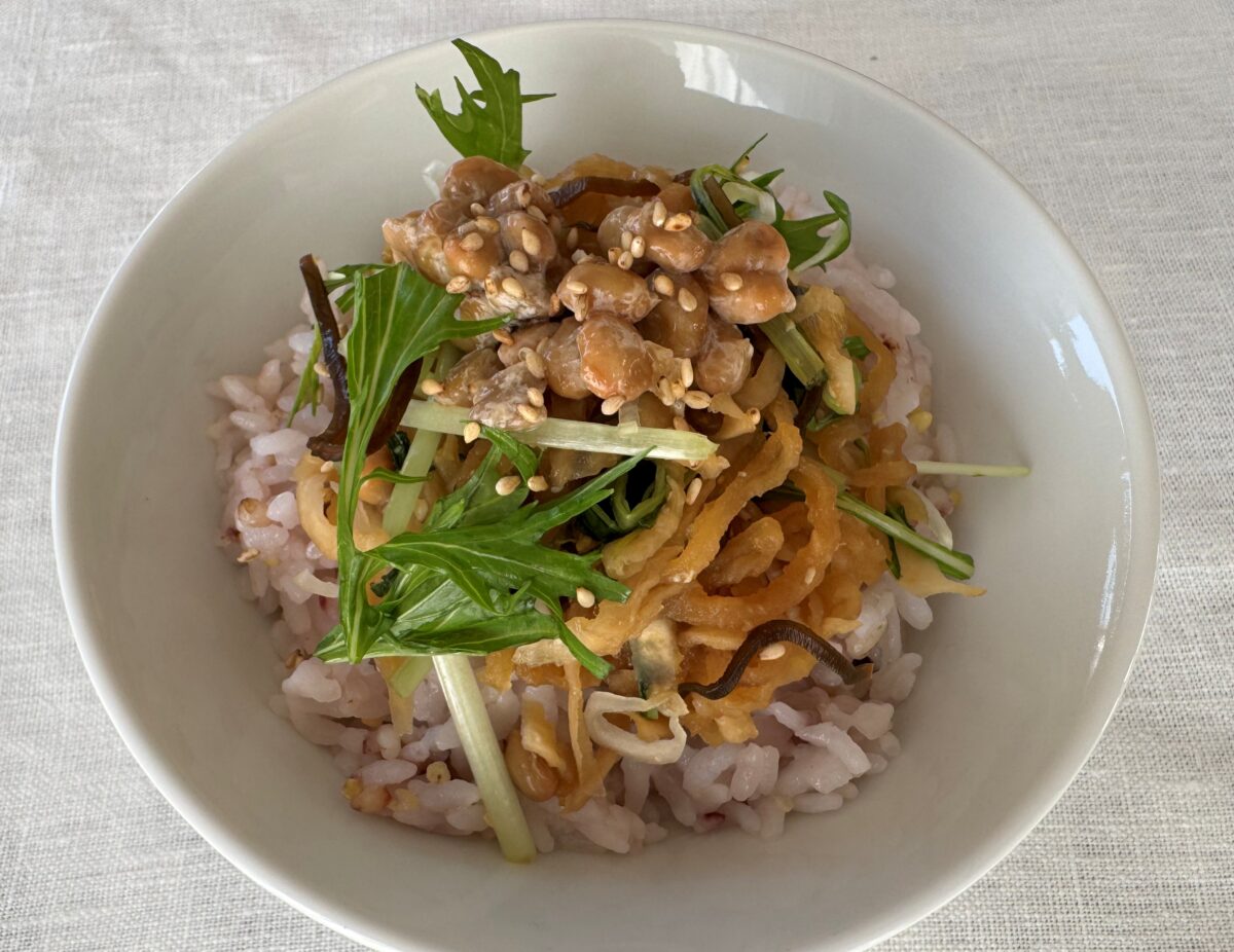 「レンジで作る切り干し大根と納豆の雑穀ごはん」
