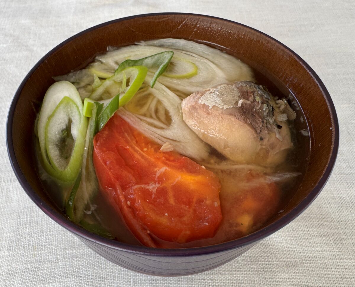 「ねぎたっぷり さば缶・トマト・春雨のみそ汁」