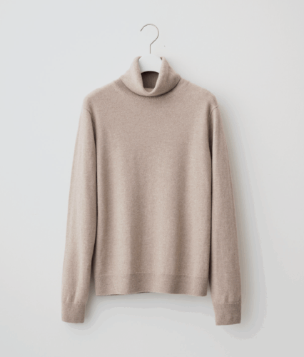 「なにより肌触りにこだわりたいのがタートルネックセーター。ベーシックで上質なものを持っていると、かなり便利です。こちらは身幅にほどよくゆとりがあり、厚み&丈の長さも絶妙。重ね着もしやすく、イン&アウト、どちらにも使える優秀アイテムです。