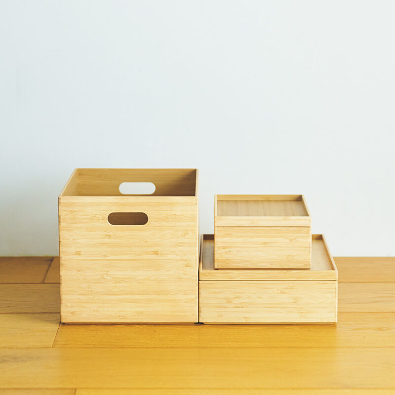 成長が早く環境負荷が少ないとされている竹材の収納ボックス。