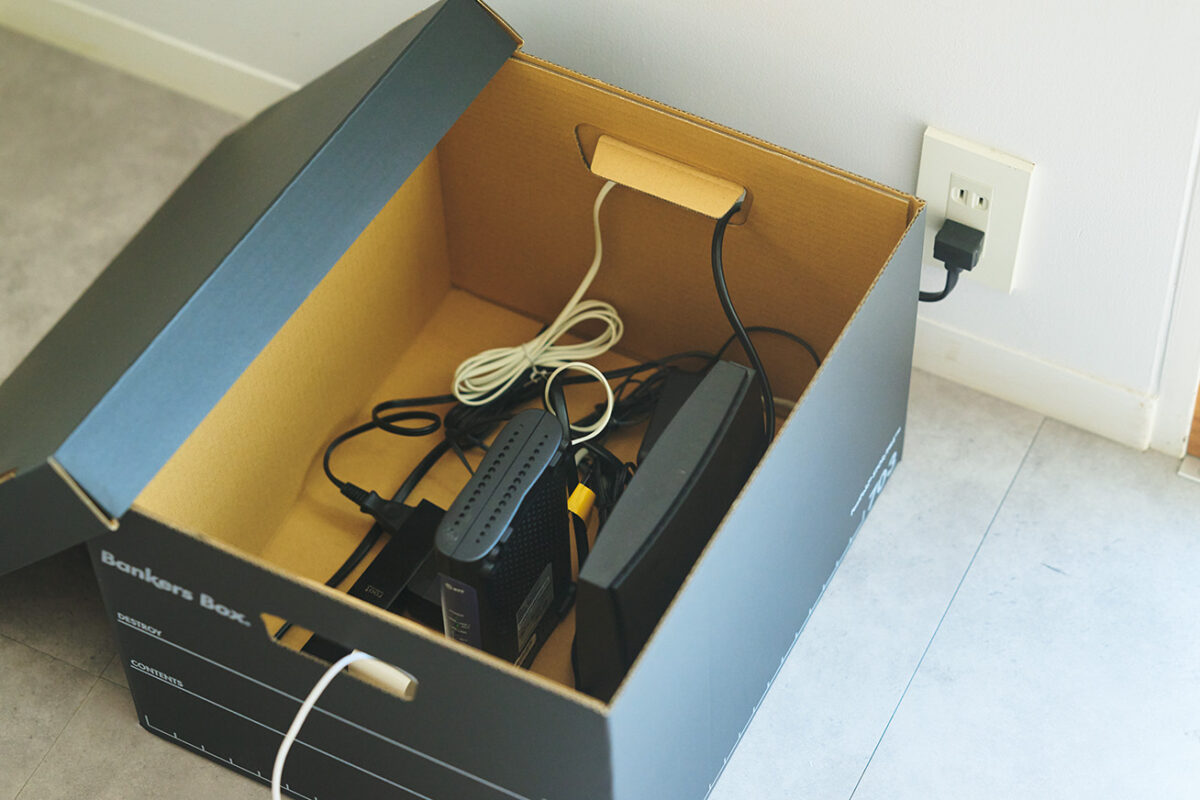ごちゃごちゃ絡まるコード類も箱に入れてしまえばすっきり!