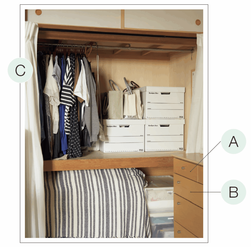 「割り当てスペースは、娘の成長とともに変化してきましたが、今はいちばん奥が私のスペース。手前が夫、反対側に娘たちの服がかかっています」。