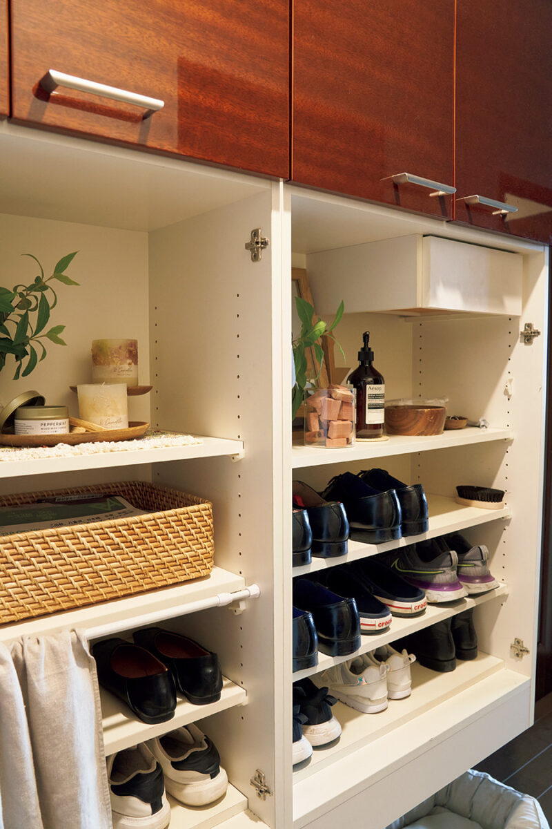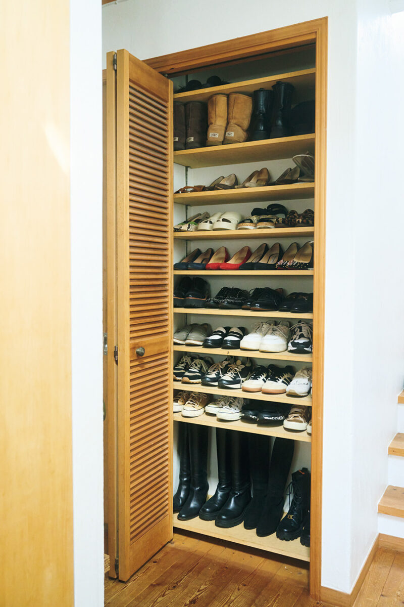 びれて見えないよう、きちんと感や清潔感を意識しています。そのシーズンに買った服なら、流行も反映されていて新鮮な気持ちで過ごせるんです」。貝賀さんは、靴収納でも扉を外して収納効率をアップ。