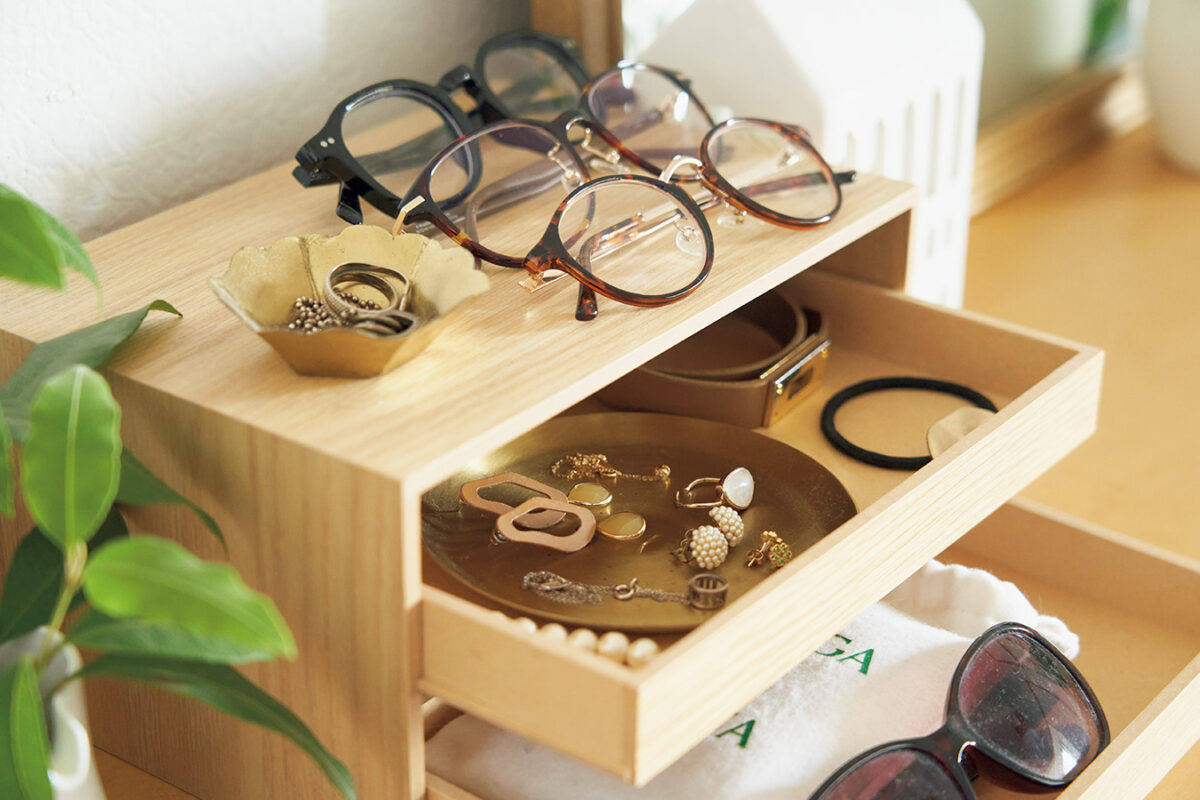 箪笥の上に小さな木製の引き出しを置き、サングラス、リーディンググラスなどを飾りながら収納。